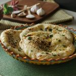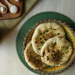 Add prepared cheese filling (2-3 tbs) and fold all edges to seal the filling then prick with skewer and roll out gently with the help of rolling pin and apply water on naan (makes 4).