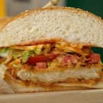 -Burger bun per tayyar fusion burger sauce dal ker pheela lein,cheddar cheese slice,fried crispy chicken patty,tamatar slices,tayyar fusion burger sauce,iceberg,chips & tomato ketchup dal ker upper sa top burger bun rakh dein.