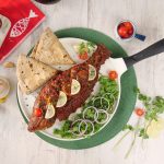 -On a griddle,add cooking oil,marinated fish & cook on low flame from both sides (4 minutes each side) & apply remaining marinade with the help of brush.