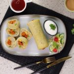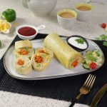 -Turn on the flame,grease pan with cooking oil,add whisked eggs & cook on low flame for 1-2 minutes than fold the potato roll on cooked egg & move to one side of pan.