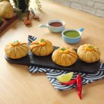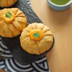 -Roll out with the help of a rolling pin (5 inches), add potato filling (3-4 tbs), make cuts & wrap dough strips over potato filling & make potli shape samosa, apply slurry to seal it. (Makes 9-10)