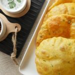 In the mashed potatoes add all-purpose flour, sufi cooking oil, roasted and crushed cumin, salt, red chili powder, turmeric powder and fresh coriander and kneed the puri dough while gradually adding water until firm dough is formed. Leave to rest for 15 minutes.