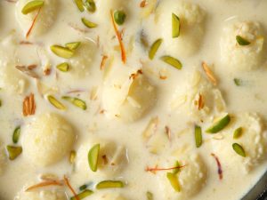 -In boiling milk,add prepared balls & cook on very low flame until they float on the surface & increase in size (don’t stir),cover & cook on low flame for 10 minutes.
