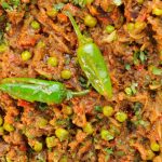-Add green chilli,grated eggplant,peas,pink salt,turmeric powder,coriander seeds,red chilli powder, cumin seeds,kashmiri red chilli powder,fennel seeds & mix well.