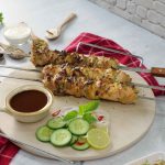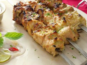 -Chicken pieces ko metal skewers mein lagayein (5 skewers bana lein).