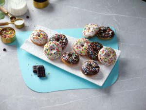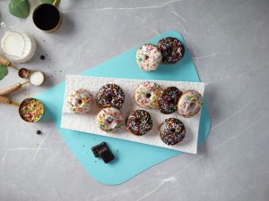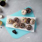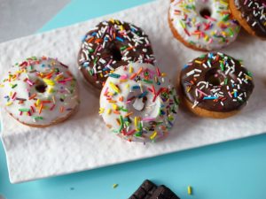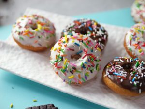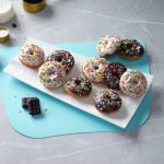 -Dip one side of doughnuts in melted chocolate & place it on wire rack to allow excess melted chocolate to drip off.