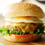 On burger bun,spread mayonnaise,add tomato,lettuce leaf,burger patty,caramelized onion,fried egg and cover with the top bun.
