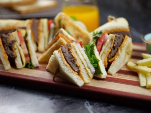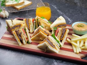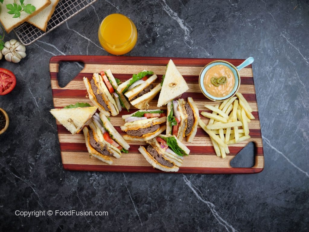 -On one bread slice,place salad leaf,tomato,onion,prepared omelet,place another bread slice,cheese slice,patty with cheese slice & cover with another bread slice.