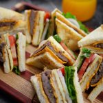 -Uske upar doosra bread slice, cheese slice aur patty with cheese rakhein, phir teesra bread slice se cover karein.