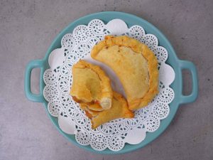 -Add chicken filling (2 tbs),apply water in the corners,fold & seal the corners (makes 8).