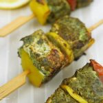 Ab marinated chicken,color bell pepper,tamatar,pyaz aur lemon slices ko skewers per assemble ker lein.