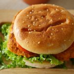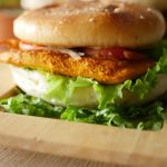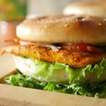 Burger bun per chutney dal ker salad patta,grilled chicken fillets,pyaz,tomato ketchup aur tamatar slices rakh dein.