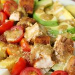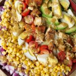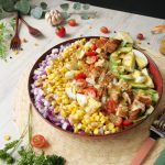 -Lettuce bed per pyaz,corn kernels,cherry tomatoes,grilled chicken,iceberg,avocado,boiled anday aur tayyar salad dressing dal ker serve karein!