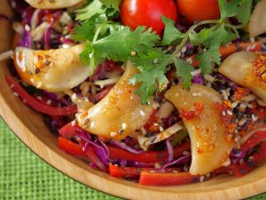 -Bowl mein lehsa,kali mirch powder,namak,Dijon mustard paste,sirka aur olive oil dal ker ache tarhan whisk ker lein.Salad dressing tayyar hai.
