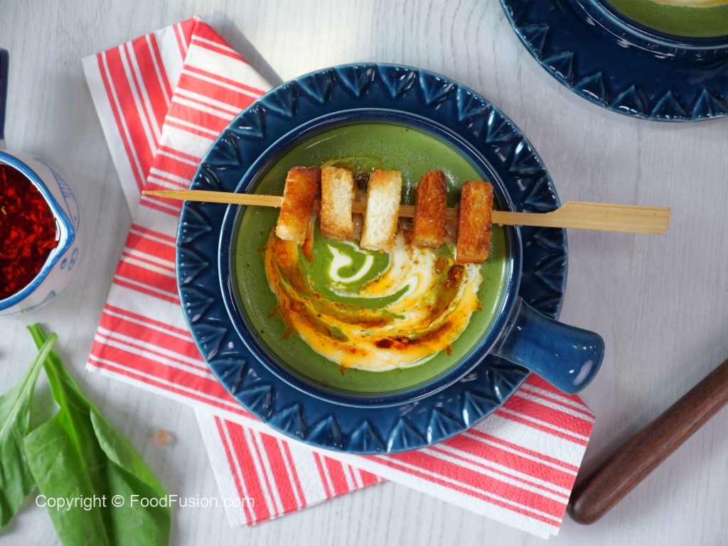 -Serving bowl mein cream of spinach soup dal kar cream aur chilli oil se garnish karein aur croutons ke saath serve karein!