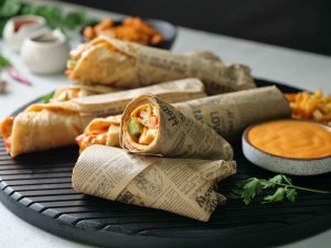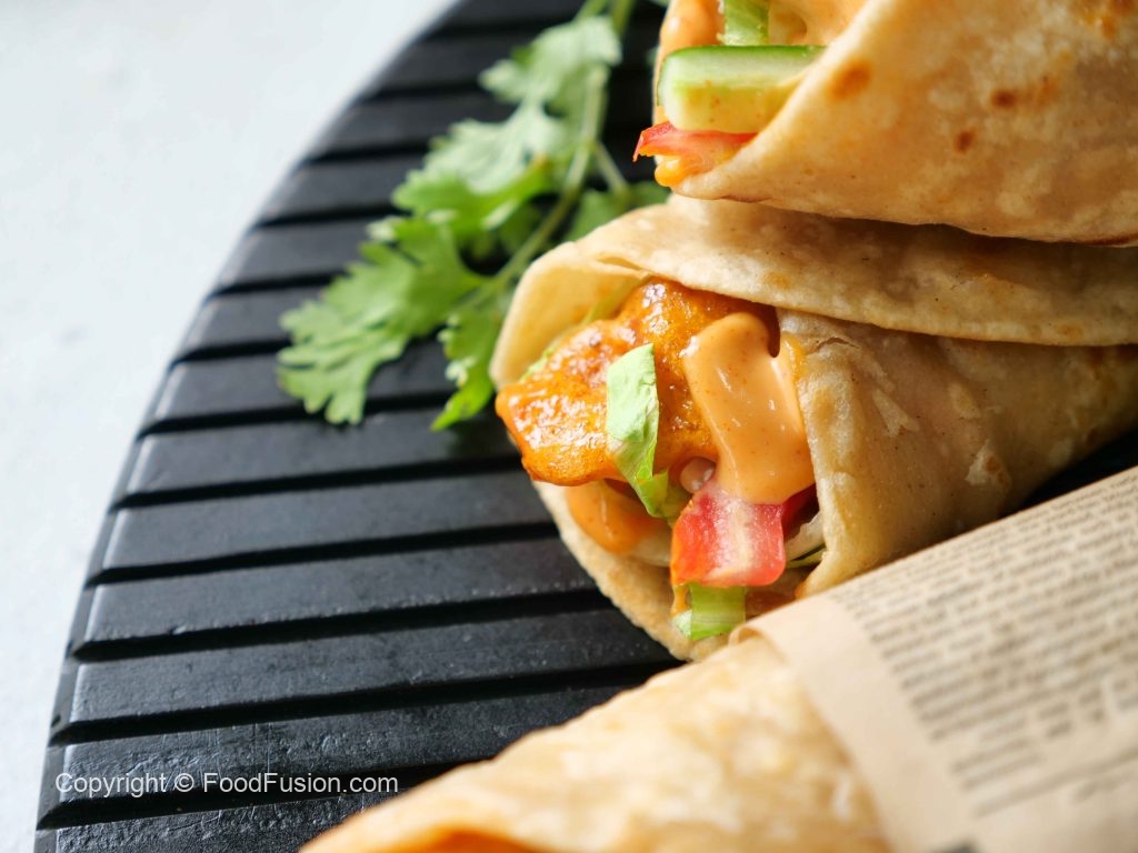 -Paratha per dynamite sauce dal ker pheela lein,iceberg,tamatar,kheera aur dynamite chicken dal kar fold karein aur butter paper mein wrap ker lein (makes 6-8 Paratha rolls).