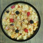 In bowl add apples (cubed), mangoes (cubed), banana (slices), dates, canned fruit, almonds (chopped) and chart masala, mix well.