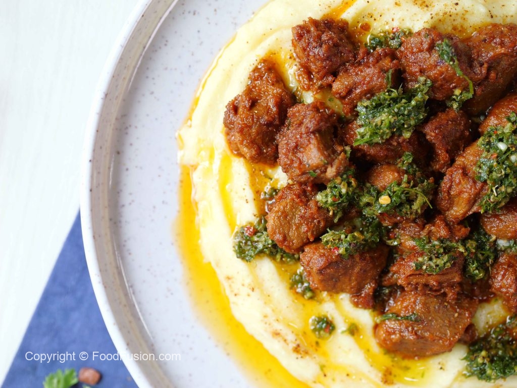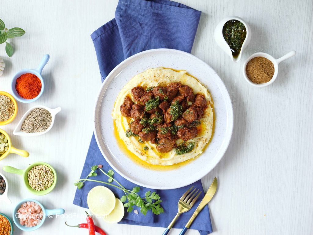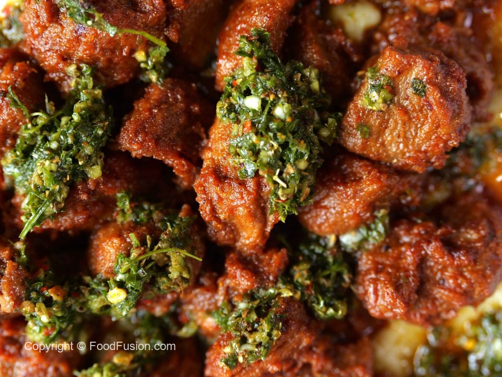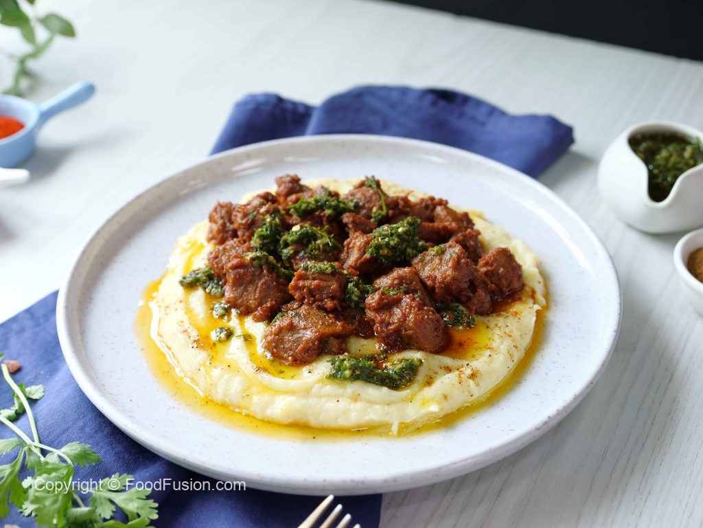 Fry beef boti paired with mashed potato and a bold chimichurri kick — flavor that hits every note. A comfort plate with a twist. #happycookingtoyou #foodfusion #araywahh