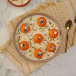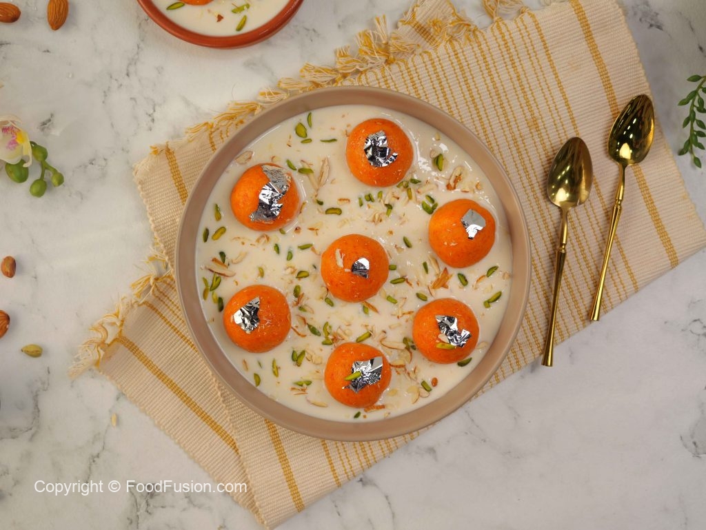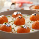 -In a serving dish, add prepared rabri doodh, prepared carrot jamun, garnish with edible silver leaf, pistachios, almonds & serve!