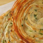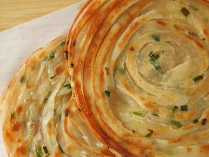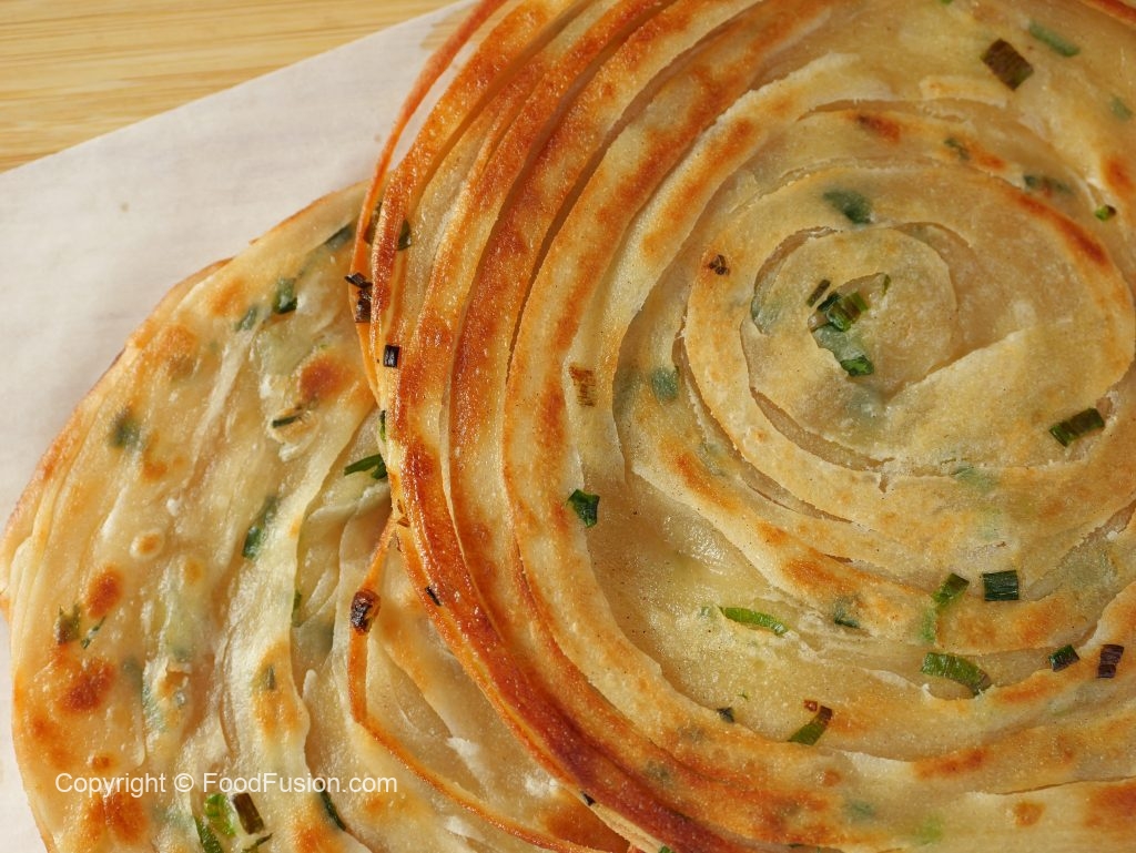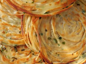 -Spread clarified butter,sprinkle dry flour & cut into thin strips,sprinkle green onion leaves & roll out 4 strips like a swiss roll (stretch in between).