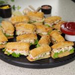 -Add tomato ketchup on both sides,place salad leaf on one side,add prepared filling & flip the other side of puff pastry biscuit & serve (makes 18-20).