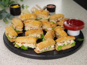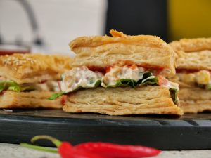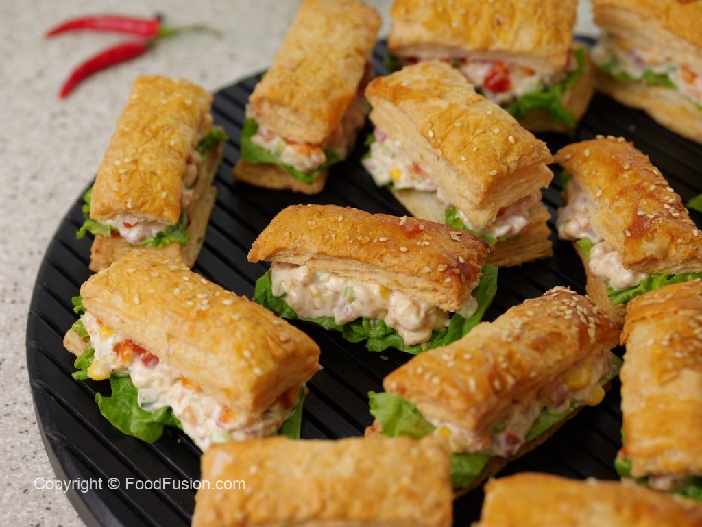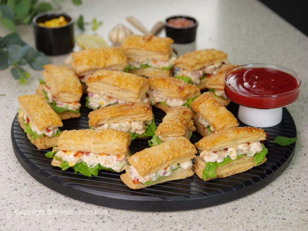 -Add tomato ketchup on both sides,place salad leaf on one side,add prepared filling & flip the other side of puff pastry biscuit & serve (makes 18-20).