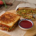 Vegetable & egg omelet per reserved vegetables,chicken salami dal ker toasted bread slice rakh dein phir flip ker ka bareek cheeni aur tomato ketchup dal dein aur top per remaining bread slice rakh dein.