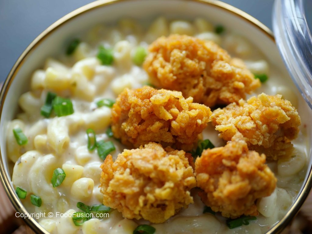 -Serving dish mein hara pyaz leaves aur popcorn chicken dal ker serve karein!