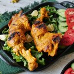 In frying pan,add marinated chicken pieces (reserve marinade for later use),water,cover & steam cook on low flame until tender (18-20 minutes) and turn sides in between.