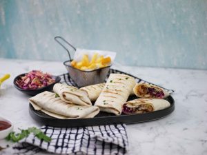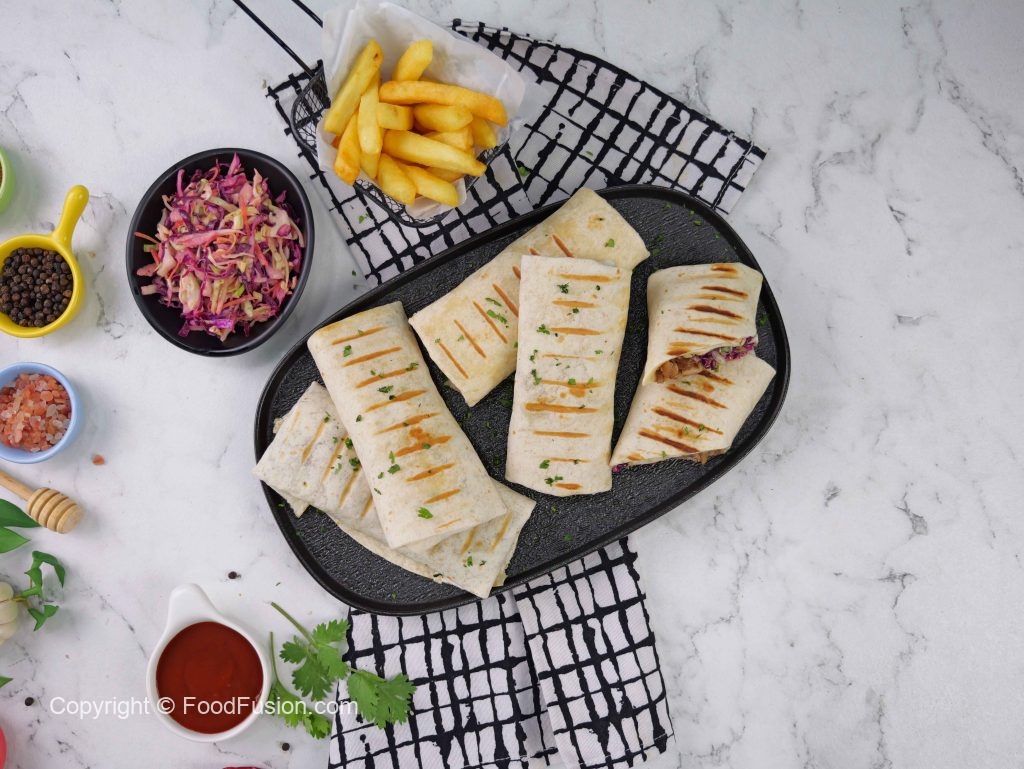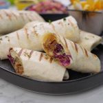 -On a tortilla, add cooked chicken, coleslaw, teriyaki glaze, grilled pineapple, sesame seeds, spring onion leaves, fold & roll up.