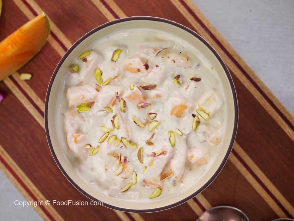 -Muskmelon ki tip ko cut karein aur seeds nikal ker cubes mein cut ker lein.