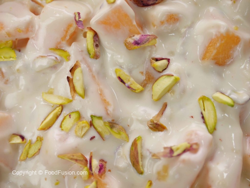 -Ab is mein muskmelon cubes,pista aur badam dal kar mix karein.