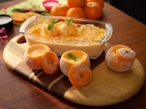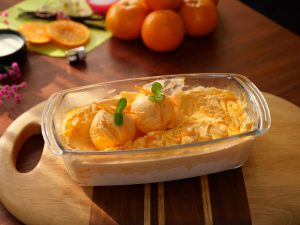 -Pour in a loaf pan, add orange syrup (Cook ½ cup orange juice with ½ cup sugar until thickened. Once cooled, your syrup is ready to use) & orange garnish, cover & freeze for 8-10 hours or overnight.