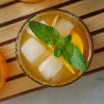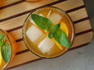 -Serving glass mein ice cubes,peach slices,tayyar peach drink aur podina dal kar serve karein!