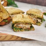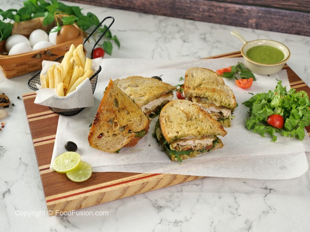 -On bread slice,add & spread prepared pesto sauce,add baby spinach,tomato slices,cheddar & mozzarella cheese,chicken fillet,cheddar & mozzarella cheese,pesto sauce & cover with another bread slice & grill for a minute until cheese melts (makes 3).