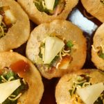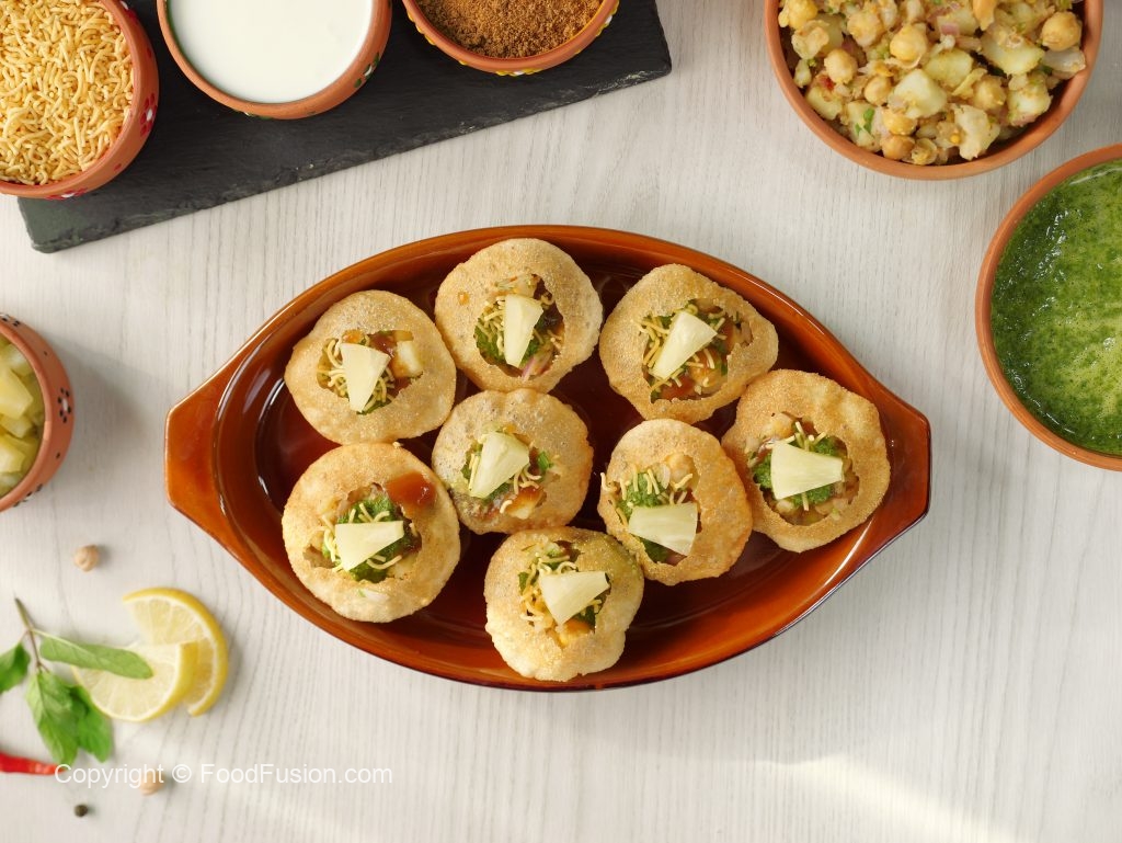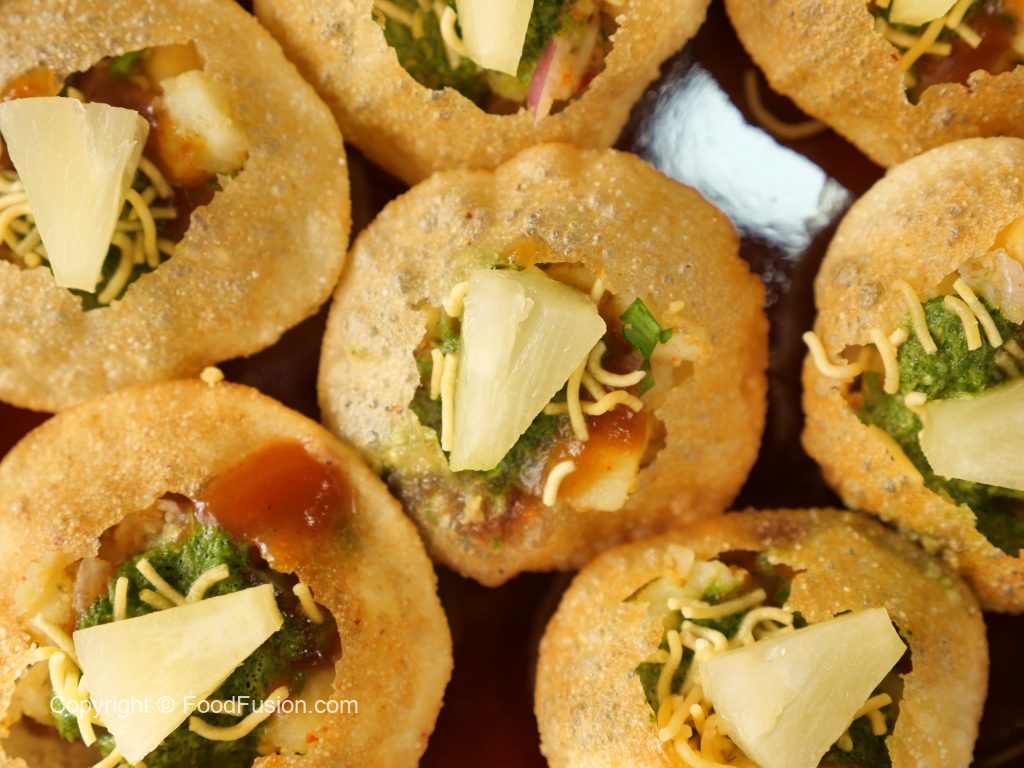 -Poke gol gappay from the center,add prepared aloo chana filling,prepared imli ki khatti meethi chutney,green chutney,pineapple chunks,nimco sev,prepared sweet & spicy pineapple pani & serve!