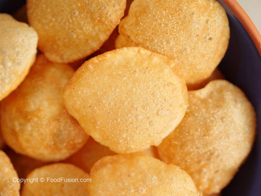 -In a wok,heat cooking oil (180C-200C) & fry on medium flame until golden & crispy (nudge or press down so that puris puff up) then strain on a net strainer & allow gol gappa to air dry for 1-2 hours at room temperature (makes 55-60).