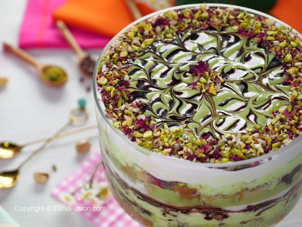 -Trifle bowl mein sabse pehle plain cake dal kar spread karein,phir sugar syrup,chocolate syrup,pista sauce,dried rose petals,pistachios,almonds aur ice cream slices daal kar layer banayein.