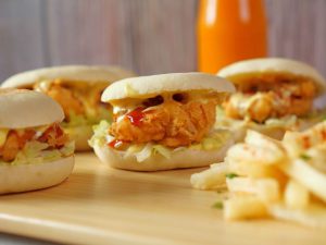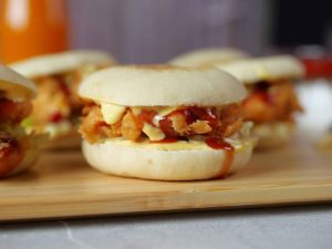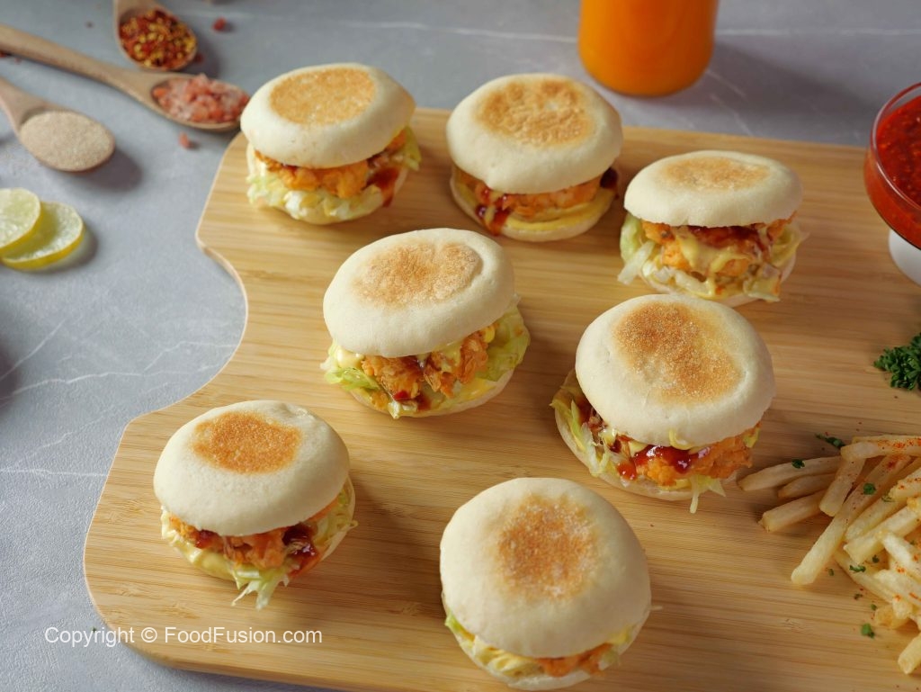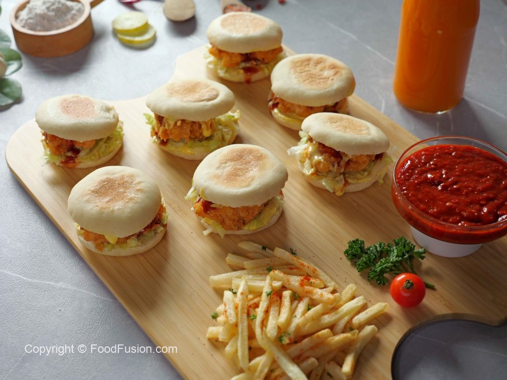 -Cut pita bun from center,add honey mustard sauce,iceberg lettuce,crispy chicken,chilli garlic sauce, cover with top bun with honey mustard sauce (makes 12).