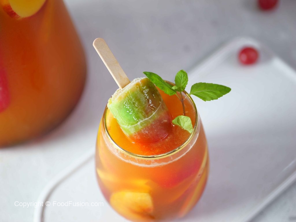 -Ab ek jug mein ice cubes, prepared lemonade, peach, red grapes, apple, lemon, orange juice, pineapple juice, sparkling water aur omore traffic light daal kar mix karen.