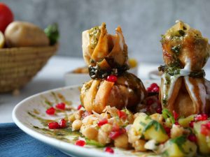 -In a serving platter,add prepared tamarind chutney,green chutney,yogurt,chana mix,potli samosa,pour yogurt,tamarind chutney, green chutney,pomegranate & serve!