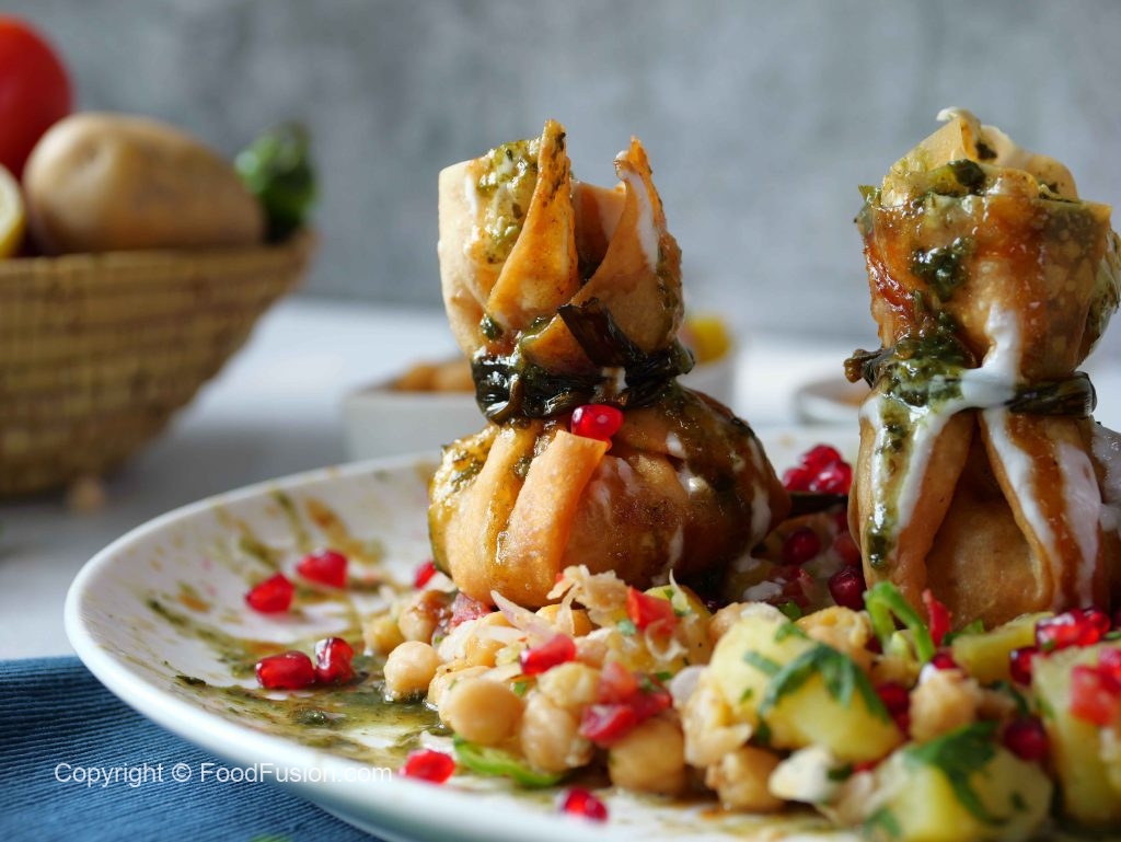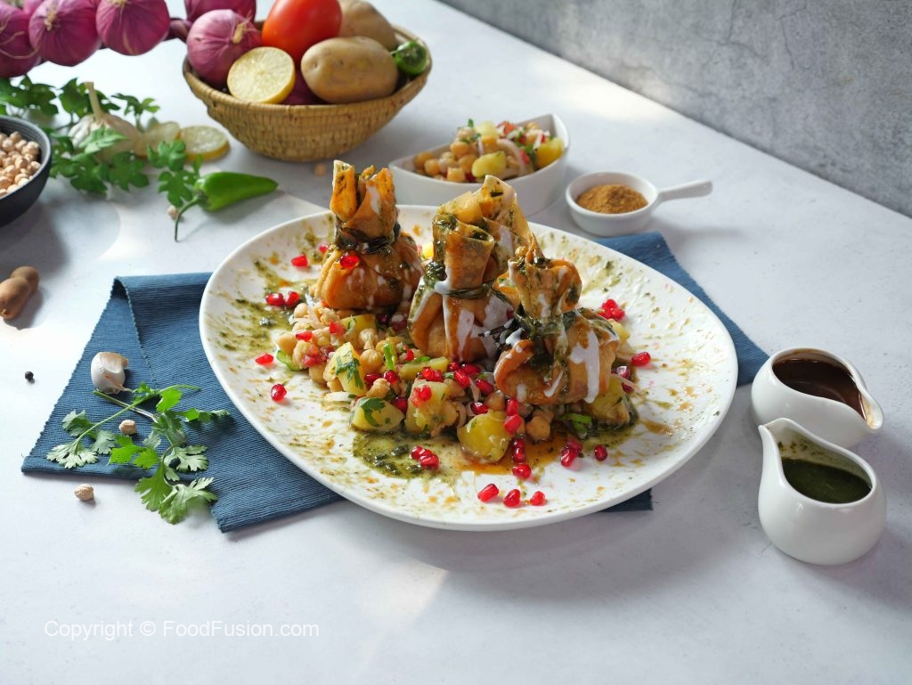 -Upar se chana mix,potli samosa,rakh kar phir se yogurt,tamarind chutney,green chutney,pomegranate daal kar serve karein.