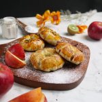 -Wrap each apple rings with puff pastry strips,poke the end of one strips in the hole,hold it with finger & wrap it around the apple ring & under (makes 4).