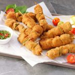 -In a wok,heat cooking oil & fry chicken skewers on low flame until golden & crispy.