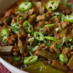 In a wok heat oil, add onion, okra, green chilies, mix well and fry them for 5-6 minutes on high flame or until golden brown. Takeout and set aside.