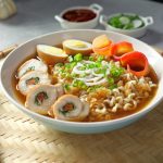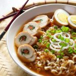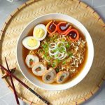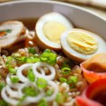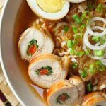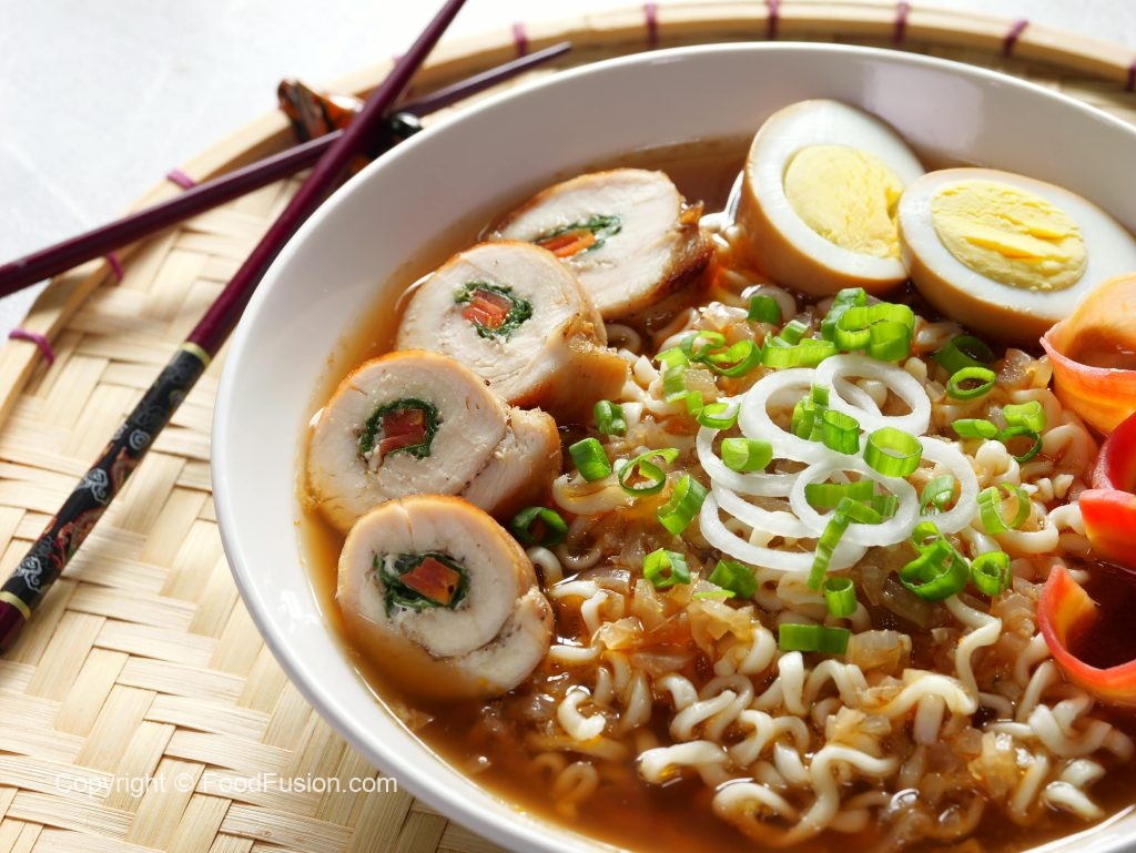 -Serving bowl mein ramen noodles, carrot, chicken slices, soy sauce eggs, reserved chicken broth, spring onion aur spring onion leaves dal kar serve karein!