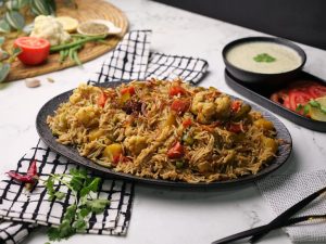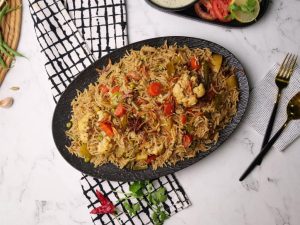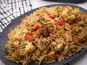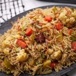 -Add capsicum,spring onion leaves,saffron essence,fried onion,cover with kitchen cloth & lid and steam cook on low flame for 10-12 minutes.