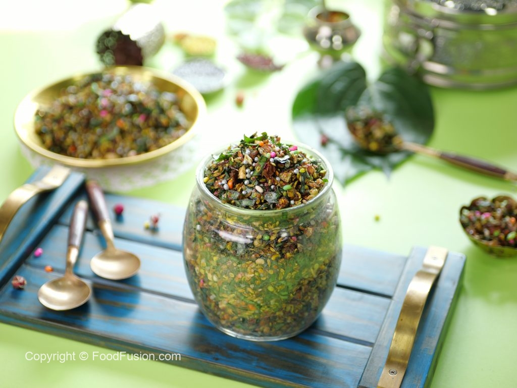 -In a large tray,add betel leaves,roasted fennel seeds,roasted dried coriander seeds,roasted almonds, roasted cashew nuts,roasted dried dates,colored desiccated coconut,betel nut,colored fennel seeds, silver mint balls,rose petal jam,cardamom powder & dried rose petals.