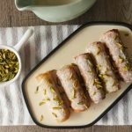 Serving dish mein bread rolls ups rakh dein aur neem garam doodh dal dein.