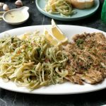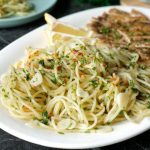 Fresh parsley aur lal mirch crushed sprinkle ker lein aur spaghetti ko grilled chicken aur 7up ka saath serve karein.
